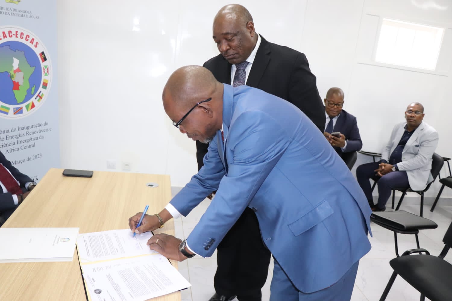 La cérémonie s’est déroulée dans les locaux du Siège du Centre pour les Énergies Renouvelables et Efficacité Énergétique de l’Afrique Centrale à Luanda, en présence notamment de Monsieur Manuel QUINTINO, Secrétaire d’État des Eaux du Ministère de l’Énergie et de l’Eau et Madame Marie Chantal Thérèse MFOULA EDJOMO, Commissaire en charge du Département Aménagement du Territoire et Infrastructures de la Commission de la CEEAC, de Monsieur l’Ambassadeur Guy Blaise NAMBO WEZET, Ambassadeur du Gabon en Angola, des hauts cadres du Ministère de l’Énergie et de l’Eau et ceux du Ministère des Relations Extérieures, des représentants des entreprises du secteur de l’énergie de la République d’Angola et du Chef de Service Énergies Renouvelables et Nouvelles de la Commission de la CEEAC Monsieur Désiré Ndemazagoa