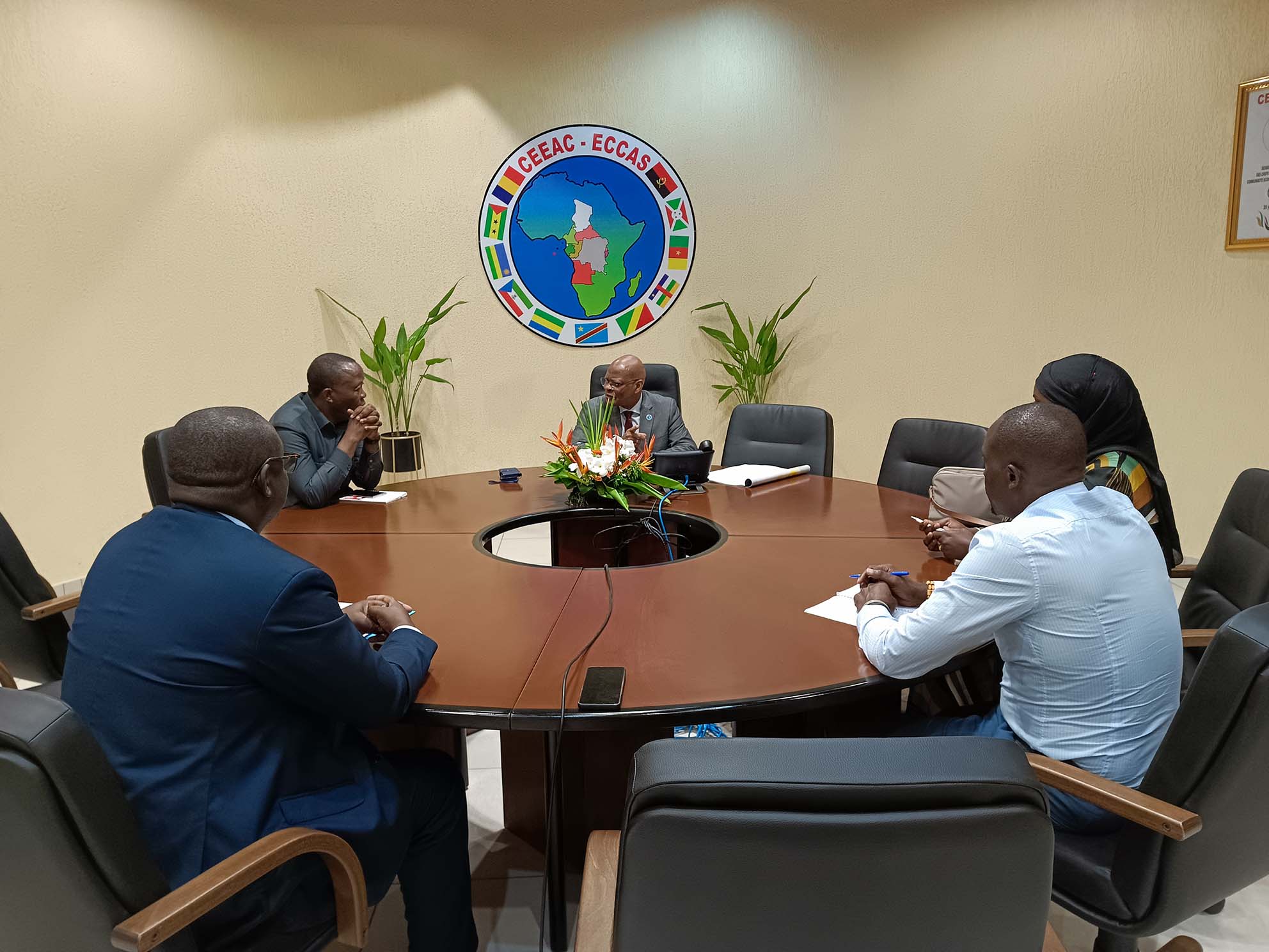 La délégation de NORCAP a été présentée au Président de la Commission de la CEEAC par le Commissaire en charge du Département Environnement, Ressources Naturelles, Agriculture et Développement Rural de la Commission de la CEEAC, Son Excellence Honoré TABUNA, assisté pour la circonstance par Monsieur Semingar NGARYAMNGAYE, Chef de Service Gestion des Risques de Catastrophes et Adaptation Aux changements Climatiques.