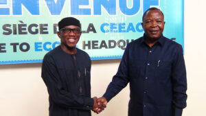 Libreville (République Gabonaise), le 12 septembre 2024- En visite de courtoisie à la commission de la Communauté Economique des Etats de l’Afrique Centrale (CEEAC), le Commissaire aux Affaires Politiques, Paix et Sécurité de l’Union Africaine, l’Ambassadeur Bankole ADEOYE a été reçu par le Commissaire à l’Environnement, Ressources Naturelles, Agriculture et Développement Rural de la Commission de la CEEAC, Dr. Honoré TABUNA, intérimaire du Président de la Commission de la CEEAC, l’Ambassadeur Gilberto Da Piedade VERISSIMO empêché.