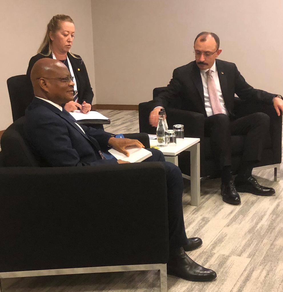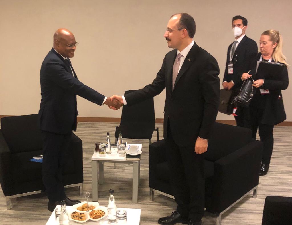 En marge des travaux du troisième forum économique et des affaires Turquie-Afrique auquel il prend activement part dans la capitale turque, le Président de la Commission de la Communauté Economique des Etats de l’Afrique Centrale(CEEAC), son Excellence Ambassadeur Gilberto Da Piedade Verissimo accompagné d’une forte délégation incluant Monsieur KANIMBA François, Commissaire au Marché Commun, Affaires Economiques, Monétaires et Financières, Madame Maria de Carma TROVOADA DE CARVALLIO SILVEIRA, Conseiller Economique du Président de la Comission et Monsieur Sosthene Mackosso, chargé de protocole déploie une intense activité diplomatique à Istanbul. On en veut pour preuve, la rencontre avec le ministre turc du commerce son Excellence Dr MEHMET MUS.