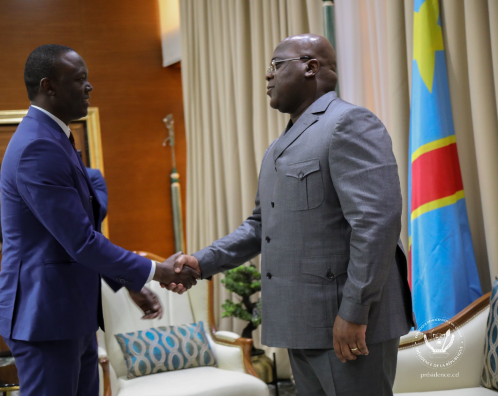 Kinshasa (Rép. Démocratique du Congo), le 02 mai 2023- Le Président de la République Démocratique du Congo Son Excellence Félix Antoine Tshisékédi Tshilombo a reçu en audience, le Président du parti d’opposition du Tchad « Le Réformateur » Monsieur Succès MASRA en présence du Président de la Commission de la Communauté Economique des Etats de l’Afrique Centrale (CEEAC), l’Ambassadeur Gilberto Da Piedade Verissimo, du Représentant Spécial du Secrétaire général de l’ONU, Chef du Bureau Régional des Nations unies pour l’Afrique Centrale (UNOCA) son Excellence Abdou Abarry et du ministre congolais du tourisme et envoyé spécial de la CEEAC pour la crise tchadienne Didier Mazenga Mukanzu.