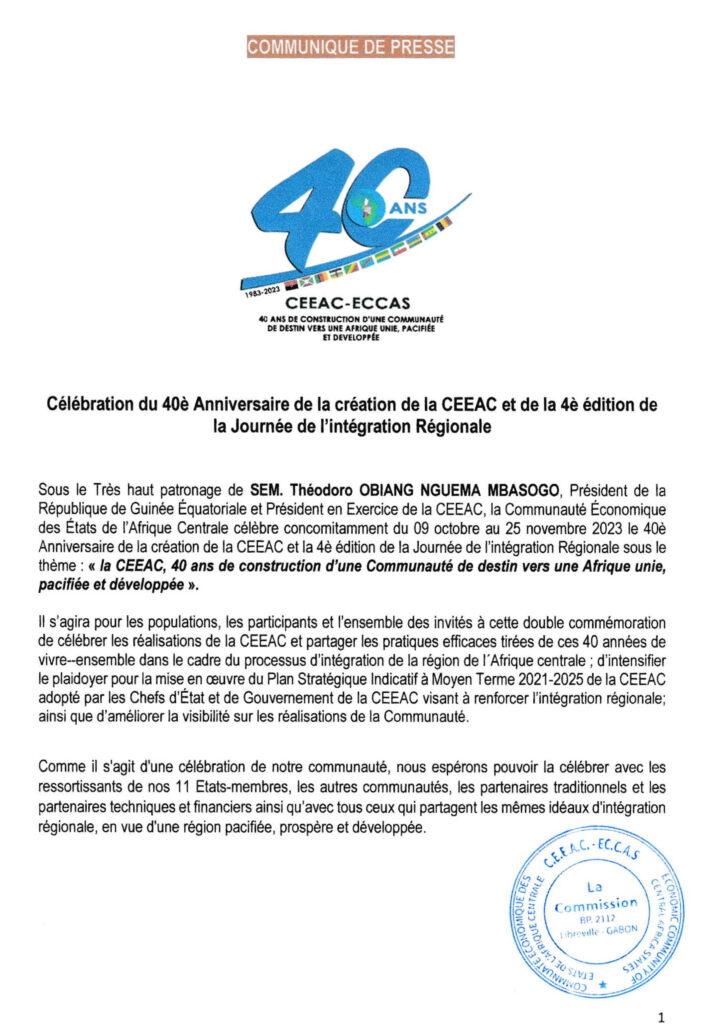COMMUNIQUE DE PRESSE- CELEBRATION 40E ANNIVERSAIRE CEEAC ET JOURNEE INTEGRATION REGIONALE Communication CEEAC 2 years ago